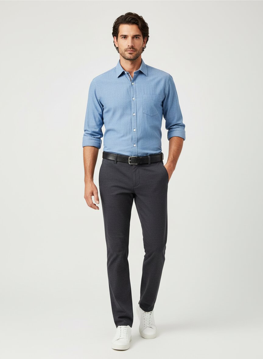 Die Lou besticht durch ihre moderne two-tone Melange in Nachtblau, die den Anschein feiner Wollstruktur erzeugt, ohne auf Elastizität zu verzichten. Der Baumwoll-Stretch-Mix mit Viskose-Anteil liegt geschmeidig an und bewegt sich mit dem Körper – kein Einengen, maximale Bewegungsfreiheit. Als klassische Chino mit Seitentaschen und geknöpften Gesäßtaschen funktioniert sie mühelos im Büro wie am Wochenende. Die melierte Färbung kaschiert kleine Verschmutzungen und wirkt dabei zeitlos elegant statt unifarben steif.