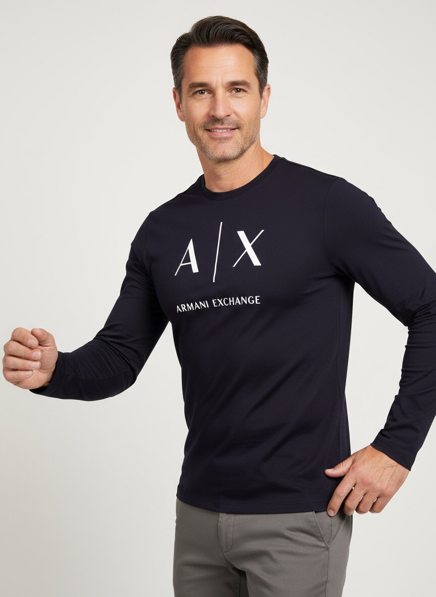 Das kräftige Marineblau wird durch den prominenten weißen Logo-Print auf der Brust zum Blickfang – eine klare Aussage ohne Umschweife. Die reine Baumwolle schmiegt sich angenehm an den Körper und bietet maximale Atmungsaktivität für warme Tage. Im schlanken Slim-Fit-Schnitt wirkt das Shirt modern und proportioniert, ideal für Alltag und Freizeit gleichermaßen. Der klassische Rundhalsausschnitt und die langen Ärmel machen es vielseitig kombinierbar – ob layering oder solo getragen. Armani Exchange überträgt die minimalistische Designphilosophie des Mailänder Hauses in zeitgenössische Basics: präzise Schnitte, hochwertige Materialien, subtile Markenpräsenz.Unser Tipp: Kombinieren Sie das Longsleeve mit einer hellen Chino und weißen Sneakern für einen klassisch-urbanen Look, oder tragen Sie es unter einer Overshirt-Jacke für zusätzliche Dimension.