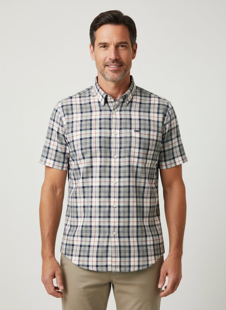 Das Hemd präsentiert sich in einem greige (grau-beige) Karomuster mit Blau- und Rottönen. Dieses zeitlose Muster macht es zu einem vielseitigen Basics-Piece für verschiedene Anlässe.