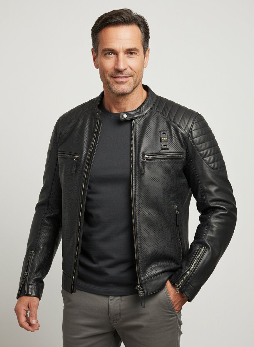 Das charaktervolle Schwarz dieser Bikerjacke wird durch die subtile Perforation des feinen Schaflleders unterbrochen – ein Detail, das Funktionalität und Ästhetik verbindet. Das geschmeidige Schafleder liegt angenehm auf der Haut und entwickelt mit der Zeit eine individuelle Patina, während die gesteppten Partien an Schultern, Ellenbogen und unterem Rücken zusätzliche Stabilität bieten. Mit Stehkragen, seitlichen Reißverschlusstaschen und dem durchgehenden Zwei-Wege-Zipper entsteht eine Jacke für urbane Abenteuer und klassische Motorrad-Ästhetik. Die Ärmelabschlüsse mit Reißverschluss ermöglichen präzise Anpassung, während das Polyester-Futter für Tragekomfort sorgt. Blauer. USA schöpft aus der Tradition der amerikanischen Polizei-Bikerjacken und interpretiert dieses ikonische Design für den modernen urbanen Lifestyle – authentisch, robust und zeitlos.Unser Tipp: Kombinieren Sie die Jacke mit dunklen Jeans und robusten Boots für einen klassischen Biker-Look, oder setzen Sie sie über einem weißen T-Shirt für urbane Eleganz ein.