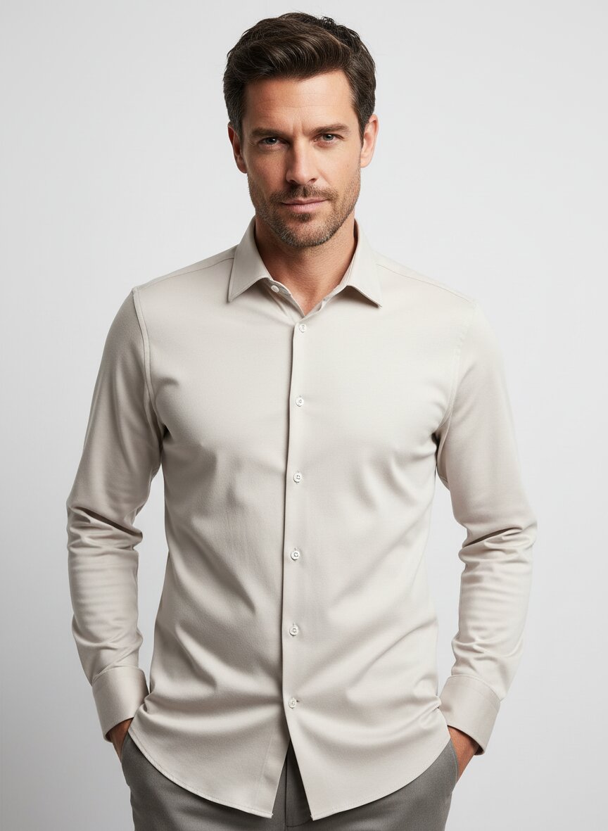 Dieses Hemd verbindet 51 % Baumwolle mit 22 % Seide zu einem geschmeidigen Baumwoll-Seide-Melange, das in zartem Sand schimmert. Die innovative Jersey-Qualität fühlt sich weich und fließend an, während sie gleichzeitig bügelleicht bleibt und den ganzen Tag über formstabil sitzt. Im Regular Fit mit klassischem Kentkragen und Sportmanschette meistert das Hemd mühelos den Übergang von Business zu Smart Casual. Die Polyester-Beimischung verstärkt die Strapazierfähigkeit und Pflegeleichtigkeit ohne Kompromisse bei der Haptik. BOGGI Milano verbindet seit 1939 italienische Schneidertradition mit technischer Innovation – dieses Hemd ist ein Paradebeispiel für diese Philosophie: Luxus, der sich im Alltag bewährt.Unser Tipp: Kombinieren Sie das Hemd mit einer anthrazitfarbenen Chino und Lederschnürschuhen für einen zeitlosen Business-Look, oder tragen Sie es offen über einem cremefarbenen T-Shirt für lässige Sommertage.