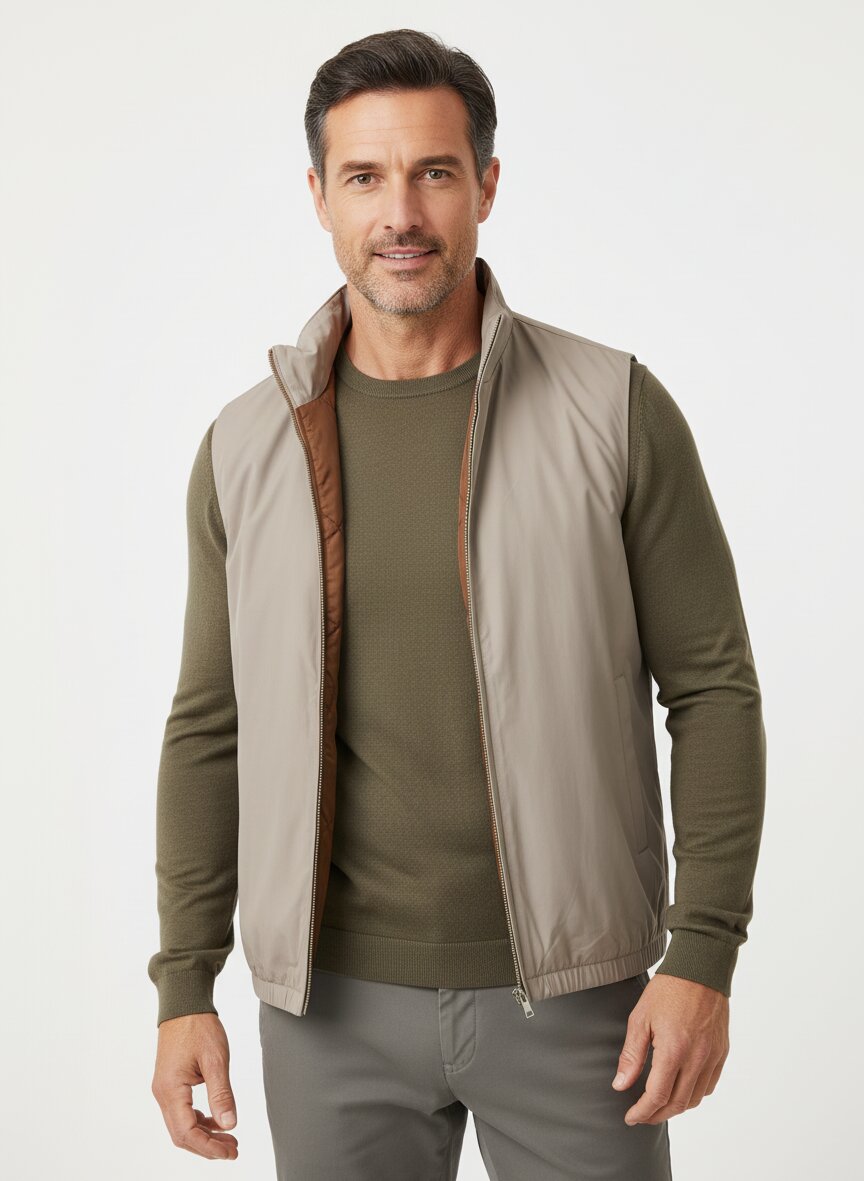 Die wasserabweisende Mikrofaser in warmem Greige verbindet Funktionalität mit dezenter Eleganz – ein Klassiker für Übergangsjahreszeiten. Das leichte Polyamid-Elasthan-Gemisch sitzt körpernah, ohne zu binden, und trocknet schnell ab. Der durchgehende Zwei-Wege-Reißverschluss ermöglicht flexible Belüftung, während die versteckte Kapuze und seitlichen Taschen praktische Details für den aktiven Alltag bieten. Elastische Säume und diverse Innentaschen unterstreichen den durchdachten Schnitt dieses Pieces. BOGGI Milano verbindet seit 1939 italienische Schneidertradition mit innovativer Funktionalstoffentwicklung – diese Weste ist das perfekte Beispiel für diese Synthese aus Stil und Alltagstauglichkeit.Unser Tipp: Kombinieren Sie die Weste über einem weißen Leinenhemd mit einer Navy-Chino für einen mühelosen Business-Casual-Look, der auch beim Wetterwechsel bestehen bleibt.