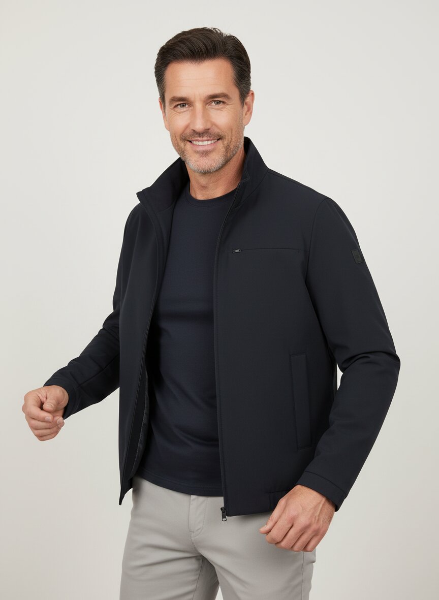 Die glatte Polyester-Mikrofaser in tiefem Navy bietet eine moderne, minimalistische Silhouette mit funktionalen Akzenten. Das Material liegt leicht an und schmiegt sich ohne Steifheit an den Körper – die wasserabweisende Beschichtung schützt zuverlässig vor Spritzwasser und leichtem Regen, ohne zu beschweren. Der durchgehende Zwei-Wege-Reißverschluss und der Stehkragen mit versteckter Regenkapuze machen sie zur perfekten Begleiterin zwischen Büro und Außentermin. Seitentaschen mit Reißverschluss sowie die nahtfein verarbeitete Brusttasche bieten praktischen Stauraum, während elastische Ärmel- und Saumabschlüsse für eine präzise Passform sorgen. BOGGI Milano verbindet seit 1939 italienische Schneidertradition mit technischer Innovation – diese Jacke verkörpert genau diese Philosophie: klare Linienführung trifft auf alltägliche Funktionalität ohne Kompromisse.Unser Tipp: Kombinieren Sie die Navy-Jacke mit einer hellen Chino und weißen Sneakern für einen urbanen Business-Casual-Look, der auch bei wechselhaftem Wetter besticht.