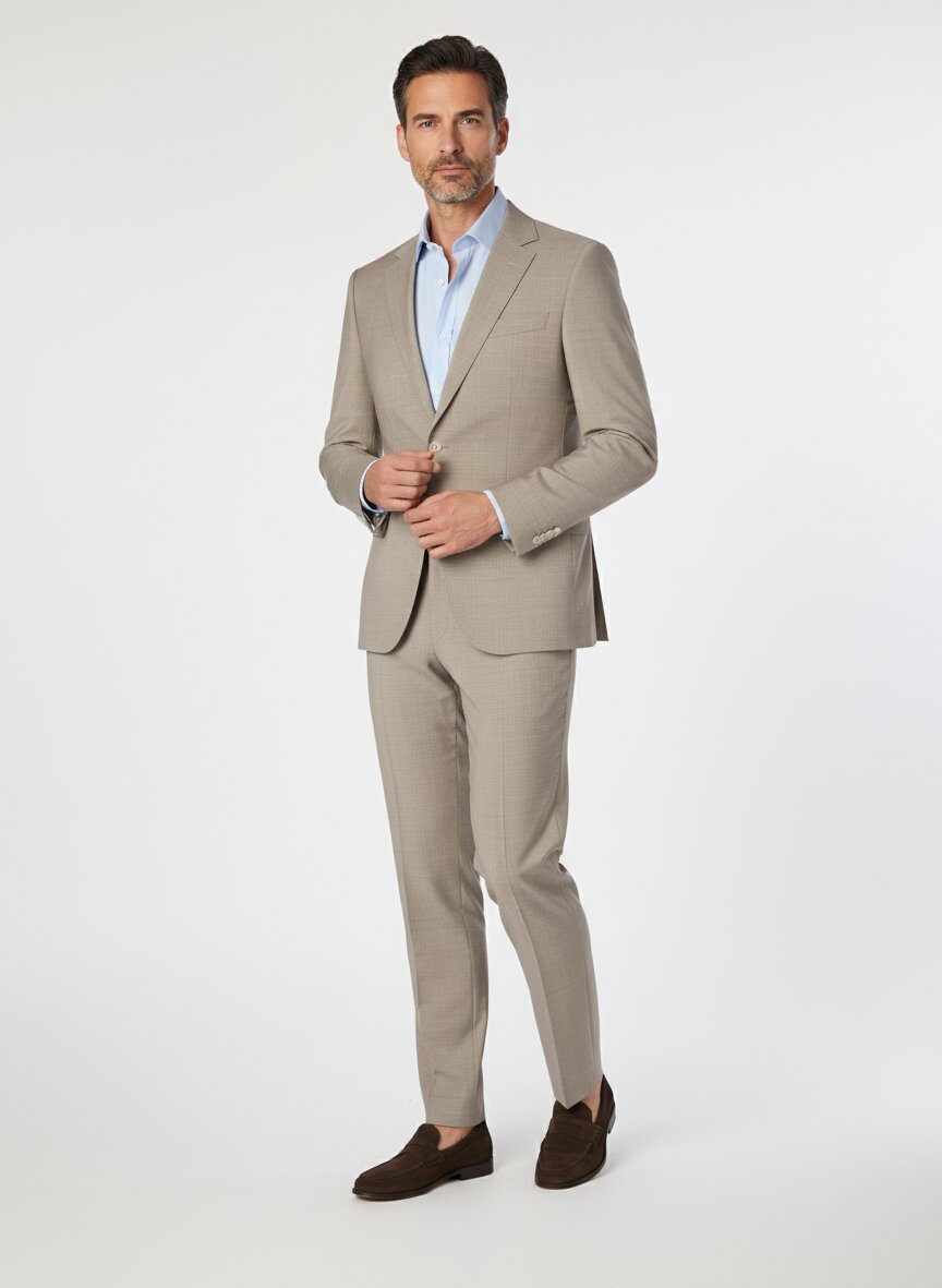 Der Anzug kombiniert den Huge-Schnitt mit Slim-Fit-Anpassung. Das bedeutet breite Revers und großzügigere Schulterpartie, während die Taille präzise geführt wird – ideal für einen modernen, urbanen Look ohne zu enge Silhouette.