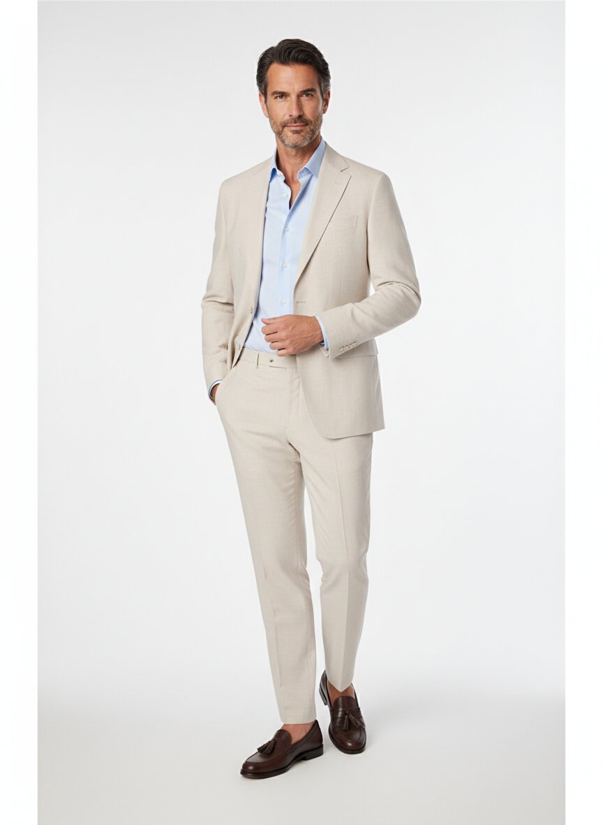 Der helle, beige melierte Anzug eignet sich perfekt für sommerliche Business-Anlässe, gehobene Freizeitveranstaltungen oder elegante Sommerfeste. Die Farbe wirkt modern und ist vielseitig kombinierbar.