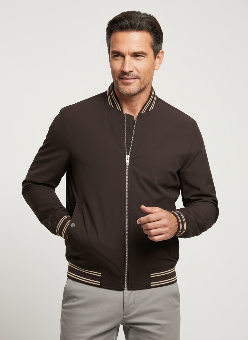 Dunkelbraune Mikrofaser-Blouson mit feinen Kontraststreifen