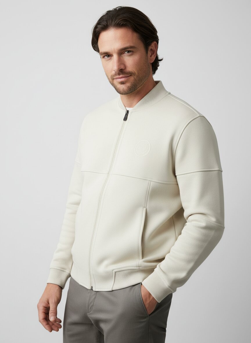 Der durchgehende Reißverschluss und der markante Collegekragen geben dieser Jacke eine zeitlose Sportlichkeit, die über Saisons hinweg trägt. Der Baumwoll-Mikrofaser-Mix mit drei Prozent Elasthan sitzt angenehm auf der Haut und bietet dabei die nötige Bewegungsfreiheit für aktive Tage. Die seitlichen Einschubtaschen und Rippenstrickbündchen an Ärmeln und Saum verleihen ihr funktionale Details ohne Umschweife. In der hellen Beige-Tönung wirkt die Jacke luftig und modern, ohne dabei an Substanz zu verlieren.