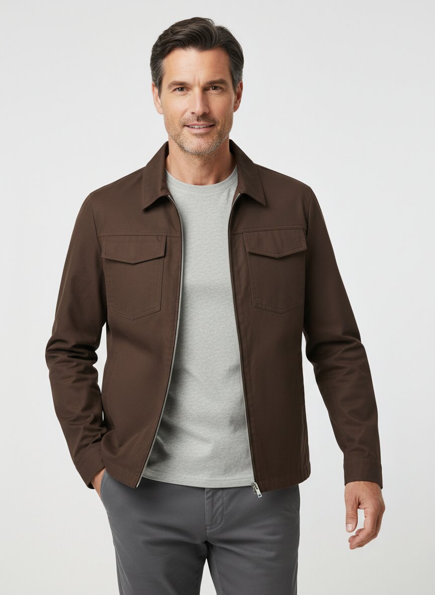 Der Zwei-Wege-Zipper und der klassische Umlegekragen geben dieser Jacke praktische Flexibilität für wechselhafte Tage. Der ausgewogene Mix aus Baumwolle, Lyocell und Polyester sorgt für atmungsaktiven Tragekomfort und behält seine Form – Lyocell bringt dabei natürliche Feuchtigkeitsregulation mit. Ob zur Chino im Büro oder zur Jeans am Wochenende: Die Jacke funktioniert mühelos in beiden Welten. Zwei Brusttaschen mit verdeckter Knopfleiste, seitliche Reißverschlusstaschen und geknöpfte Ärmelmanschetten zeigen handwerkliche Sorgfalt im Detail. Bugatti verbindet seit 1978 europäische Designtraditionen mit ostwestfälischer Verarbeitungsqualität – diese Jacke verkörpert genau diesen Anspruch: kontinentale Eleganz ohne Umschweife.Unser Tipp: Kombinieren Sie die braune Jacke mit einer hellen Chino und strukturiertem Hemd für einen zeitlosen Business-Casual-Look, der auch in den Sommer übergeht.
