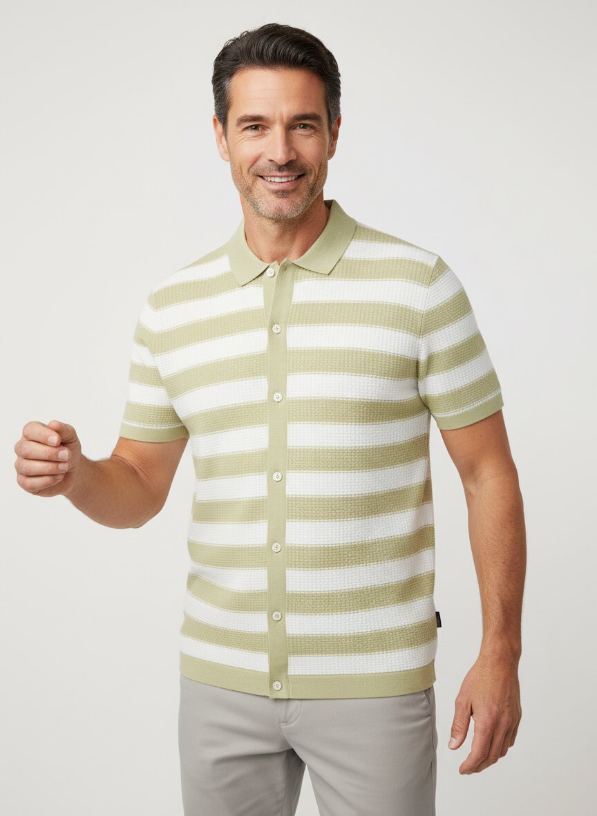 Das Kurzarmhemd besticht durch sein dezentes Streifenmuster in Sand und Weiß, das durch die aufwendige Strukturstricktechnik zusätzliche Tiefenwirkung erhält. Der Baumwoll-Polyester-Mix (50/50) bietet angenehme Atmungsaktivität und trocknet schnell – ideal für warme Tage ohne Schwitzflecken. Der klassische Polo-Kragen und die Knopfleiste machen das Hemd sowohl im Business-Casual als auch in der Freizeit tragbar. Rippenstrickbündchen an Ärmeln und Saum sorgen für eine formbeständige Silhouette, die auch nach mehreren Wäschen ihre Passform bewahrt. Bugatti verbindet seit 1978 europäische Designvielfalt mit ostwestfälischer Handwerkskunst – dieses Hemd zeigt, wie die Marke kontinentale Eleganz in alltagstaugliche Qualität übersetzt.Unser Tipp: Kombinieren Sie das Strickhemd mit einer leichten Baumwoll-Chino und Segelschuhen für einen entspannten Sommer-Look, der mühelos zwischen Strand und Stadt funktioniert.