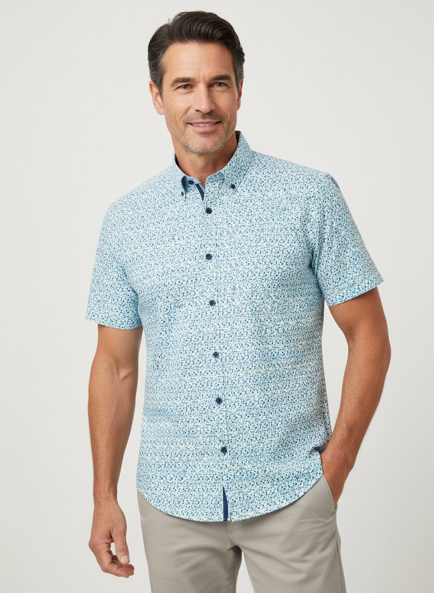 Grün-blau gemustertes Kurzarmhemd mit charakteristischer Ärmelumschlag-Optik