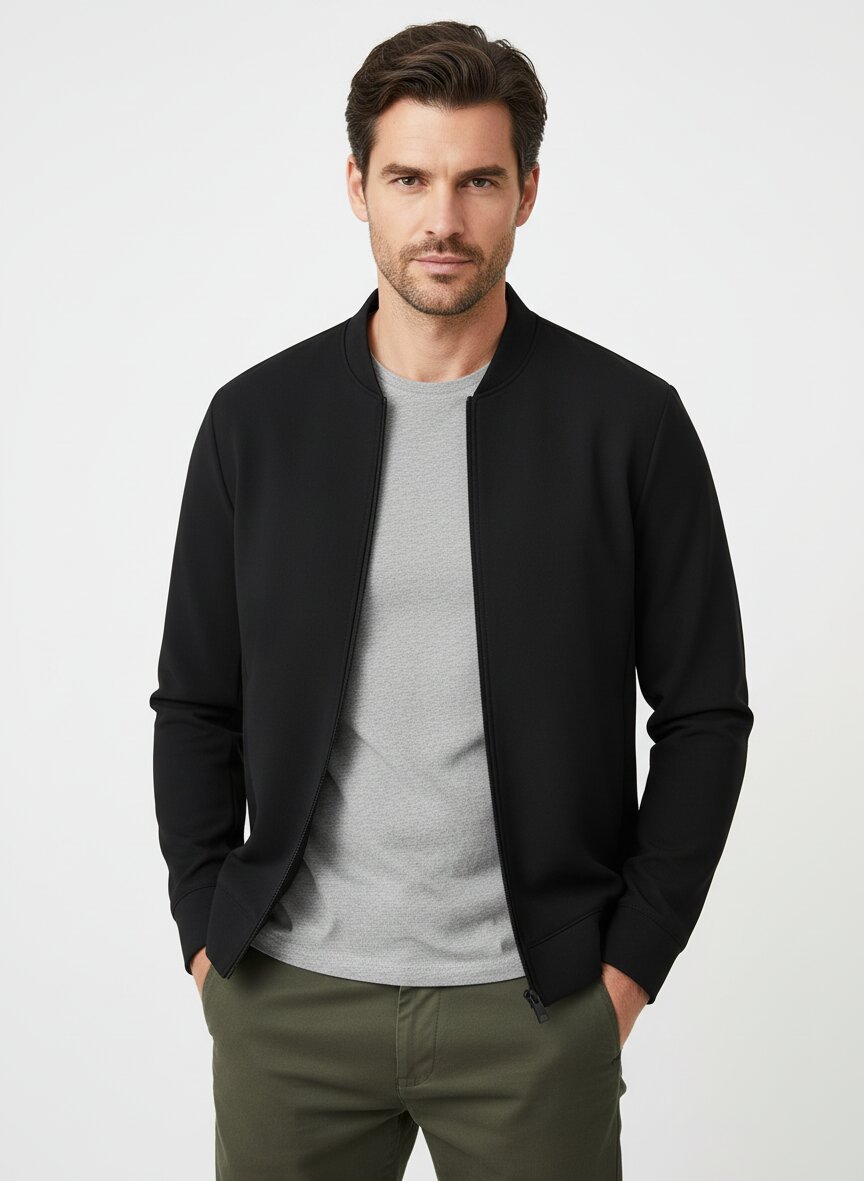 Der charaktervolle Kragen verleiht dieser Jacke sofort eine unverwechselbare Silhouette, die zwischen Sportswear und urbaner Eleganz schwebt. Das innovative Materialmix aus recyceltem Polyester, Polyamid, Viskose und Elasthan bietet Bewegungsfreiheit ohne Kompromisse – die Fasern liegen geschmeidig an und behalten ihre Form dauerhaft. Der durchgehende Zwei-Wege-Reißverschluss und die seitlichen Einschubtaschen machen sie zum zuverlässigen Begleiter für Alltag und Business gleichermaßen. Elastische Bündchen an Ärmeln und Saum sorgen für eine präzise Passform, die nicht verrutscht – ein Detail, das den Unterschied macht. CINQUE verbindet hier italienische Lässigkeit mit deutscher Handwerkskunst: eine Jacke, die weiß, wer sie trägt.Unser Tipp: Kombinieren Sie die schwarze Cicross mit einer cremefarbenen Chino und minimalistischen Sneakern für einen modernen Smart-Casual-Look, der von Montag bis Samstag funktioniert.