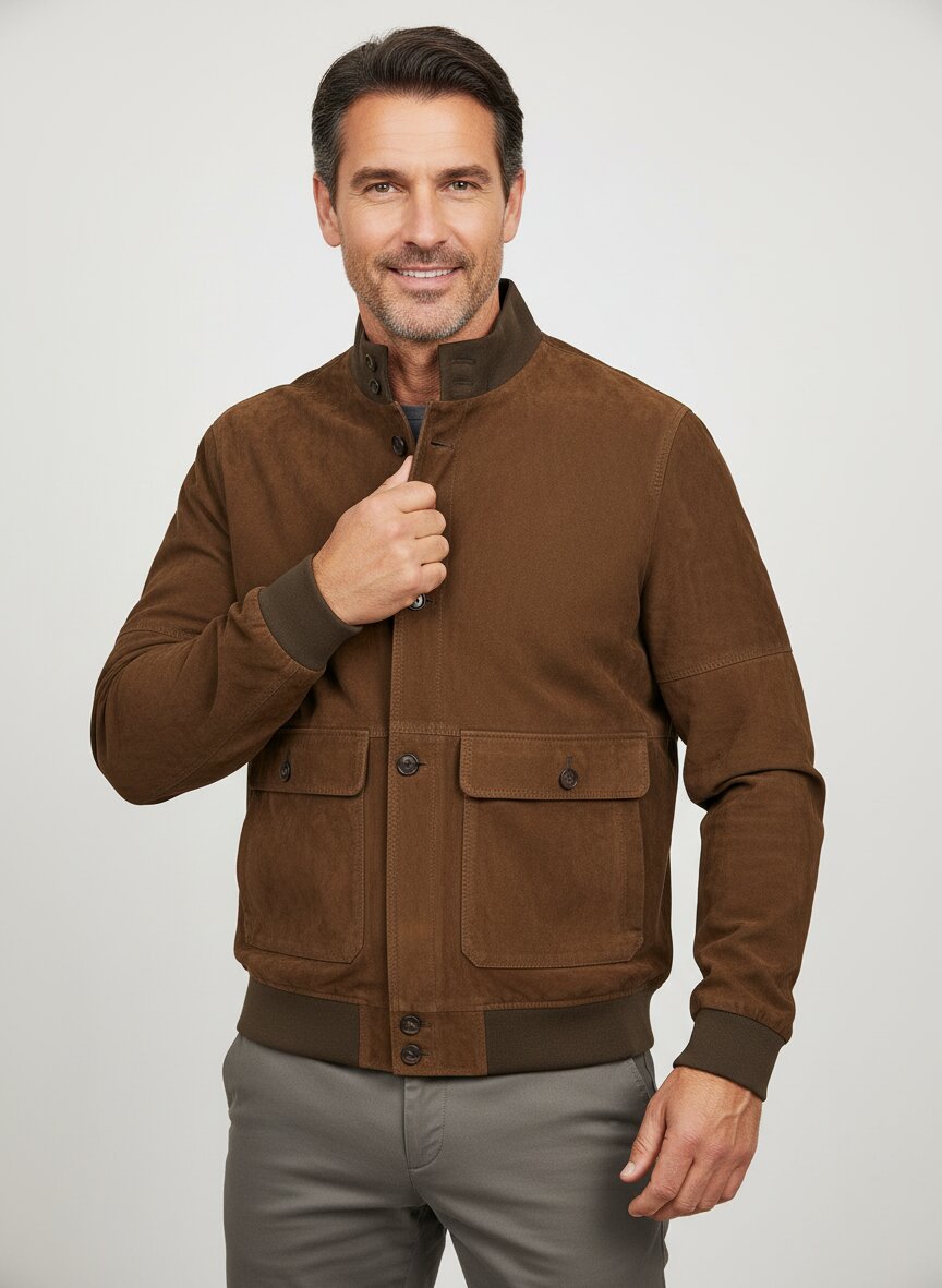 Die Jacke ist aus hochwertigem Ziegenvelours in tiefem Braun gefertigt. Dieses Material zeichnet sich durch seine besondere Weichheit und angenehme Haptik aus.