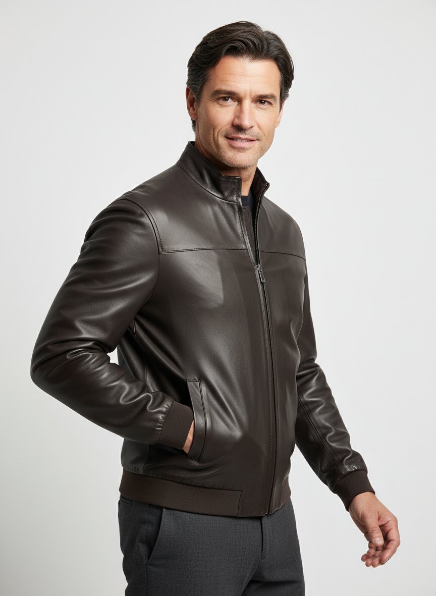 Dunkelbraunes Lammnappa mit Stehkragen und Zwei-Wege-Reißverschluss