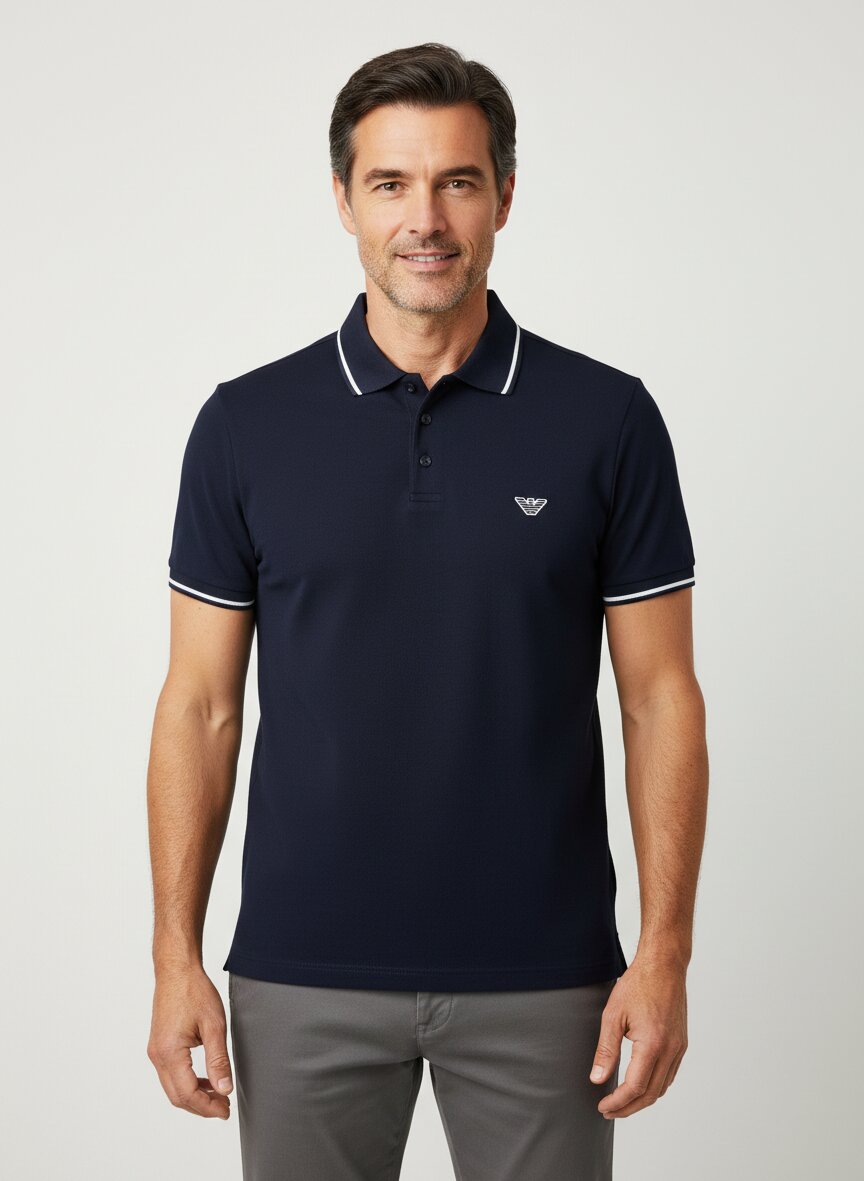 Dieses Polo-Shirt in tiefem Marineblau besticht durch feine Kontraststreifen am Kragen und an den Ärmelbündchen, die dem klassischen Design eine subtile sportliche Note verleihen. Das Material aus 100% Baumwolle in Piqué-Qualität bietet angenehme Atmungsaktivität und eine griffige Oberfläche, die auch bei regelmäßigem Tragen ihre Form bewahrt. Die Kurzarm-Silhouette mit Knopfleiste und seitlichen Schlitzen eignet sich mühelos für Business-Casual-Situationen genauso wie für entspannte Wochenenden. Die großzügige Passform bei einer Rückenlänge von etwa 70 cm in Größe M garantiert komfortables Sitzen ohne Einengung. Emporio Armani verbindet hier das italienische Verständnis für zeitlose Eleganz mit sportiver Alltagstauglichkeit – ein Polo, das ohne Kompromisse zwischen Couture und Komfort steht.Unser Tipp: Kombinieren Sie das Navy-Polo mit einer hellen Chino und weißen Sneakern für einen frischen, modernen Casual-Look oder wählen Sie eine Leinenbluse in Creme für eine elegantere Variante.
