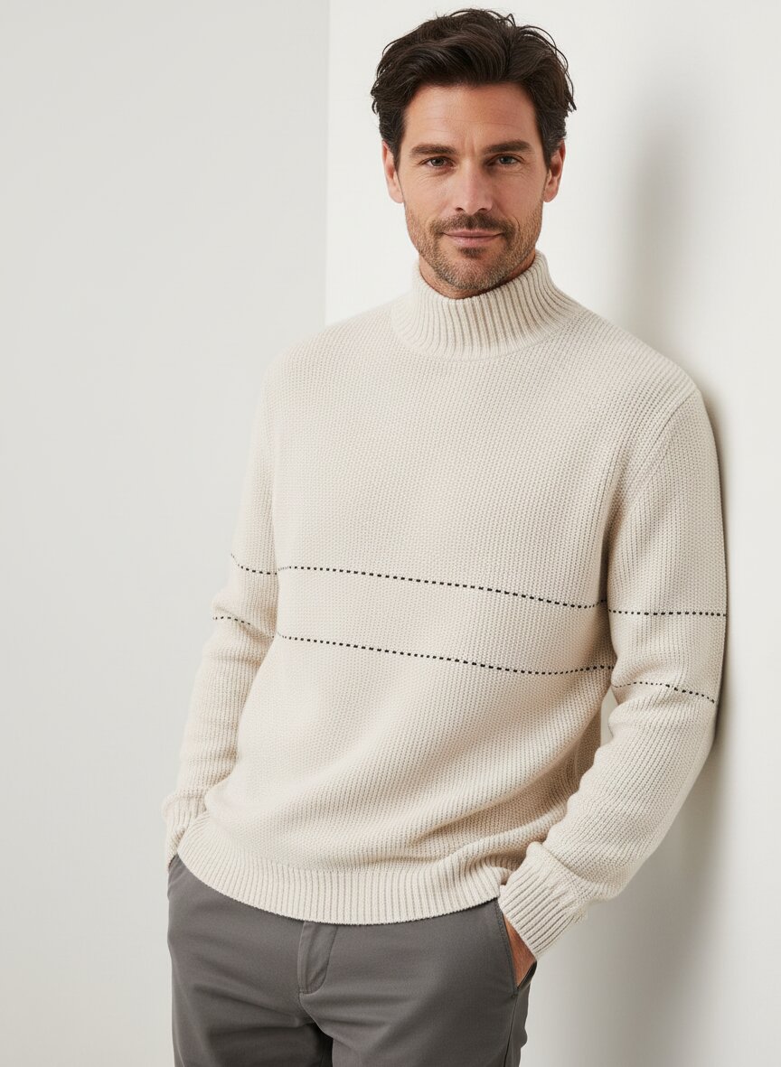 Der warme Sandton und das feine Perlstrickmuster verleihen diesem Pullover eine dezente Textur mit elegantem Understatement. Die hochwertige Wollmischung wärmt zuverlässig und fühlt sich dabei weich und kratzfrei auf der Haut an. Mit seinem markanten Stehkragen in Rippenstrick und der Rollkante am Saum wirkt er modern und zugleich zeitlos – ideal für Business-Casual-Looks oder entspannte Stadtmomente. Die neutrale Farbgebung macht ihn zum vielseitigen Begleiter, während die strukturierte Oberfläche für visuelle Tiefe sorgt. Emporio Armani zeigt hier seine Stärke für reduzierte Eleganz – italienisches Design ohne Übertreibung, mit Fokus auf Qualität und tragbare Raffinesse. Perfekt für die kühleren Monate, wenn Schichtenlooks und warme Materialien gefragt sind.Unser Tipp: Kombinieren Sie den Pullover zu einer dunkelblauen Wollhose und Chelsea-Boots für einen stilvollen Herbstlook.