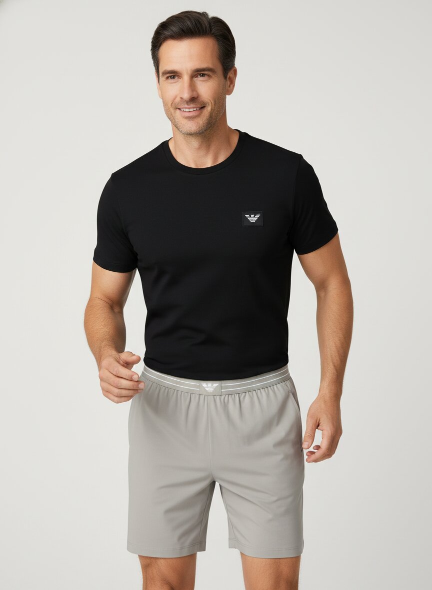 Das Set besticht durch sein zeitloses Farbspiel aus tiefem Schwarz und warmem Grau, unterstrichen durch das diskrete Armani-Logo-Patch auf den Shorts. Der weiche Baumwoll-Jersey mit 5% Elasthan-Anteil liegt angenehm auf der Haut und bietet optimale Bewegungsfreiheit beim Schlafen. Das T-Shirt mit klassischem Rundausschnitt kombiniert sich mühelos mit den Shorts, deren gestreifter Webgummi-Bund Halt ohne Druckstellen bietet. Praktische seitliche Taschen an den Shorts runden die durchdachte Ausstattung ab. Emporio Armani überträgt seine Designprinzipien auch auf Loungewear: klare Schnitte, hochwertige Materialien und italienische Qualitätsstandards für den privaten Alltag. Im Frühjahr und Sommer bietet das atmungsaktive Material angenehme Kühle für erholsame Nächte.Oberteil: T-Shirt mit Rundausschnitt