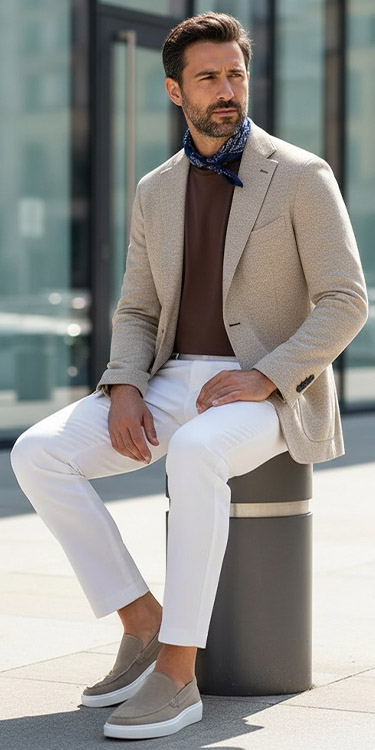 Im Zentrum steht das flexible Sakko von Boggi Milano, das durch seine leichte Verarbeitung und Bewegungsfreiheit überzeugt. Das T-Shirt von Daniele Fiesoli hält den Look entspannt, während das Ascot Bandana einen dezenten Akzent setzt. Die helle Hose von Alberto sorgt für eine klare Silhouette, ergänzt durch Slipper von Rosso e Nero. Ein Outfit, das Komfort und moderne Linien souverän verbindet.