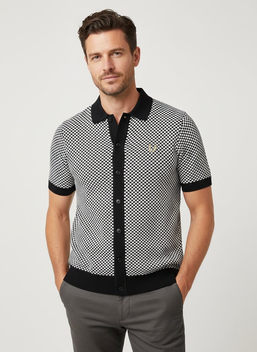 Klassisches Schachbrettmuster in Schwarz-Weiß auf feinem Strickhemd