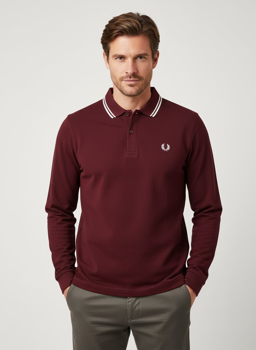 Das satte Bordeauxrot erhält durch die Kontraststreifen am Kragen eine sportlich-elegante Note. Das reine Baumwoll-Piqué fühlt sich griffig an und sorgt für atmungsaktiven Tragekomfort bei kühleren Temperaturen. Die schmale Passform und die Rippenstrickbündchen an den Ärmeln verleihen dem Polo eine moderne, körpernahe Silhouette. Die dezente Logostickerei auf Brusthöhe links unterstreicht den authentischen Fred Perry-Stil. Fred Perry verbindet seit 1952 britische Tennistradition mit subkulturellem Charisma – der Lorbeerkranz steht für zeitlose Eleganz mit rebellischem Unterton. Dieses Langarm-Polo eignet sich ideal für die Übergangszeit und kühlere Herbsttage.Unser Tipp: Tragen Sie das Polo zu einer dunklen Jeans und Chelsea Boots für einen stilvollen Casual-Look.