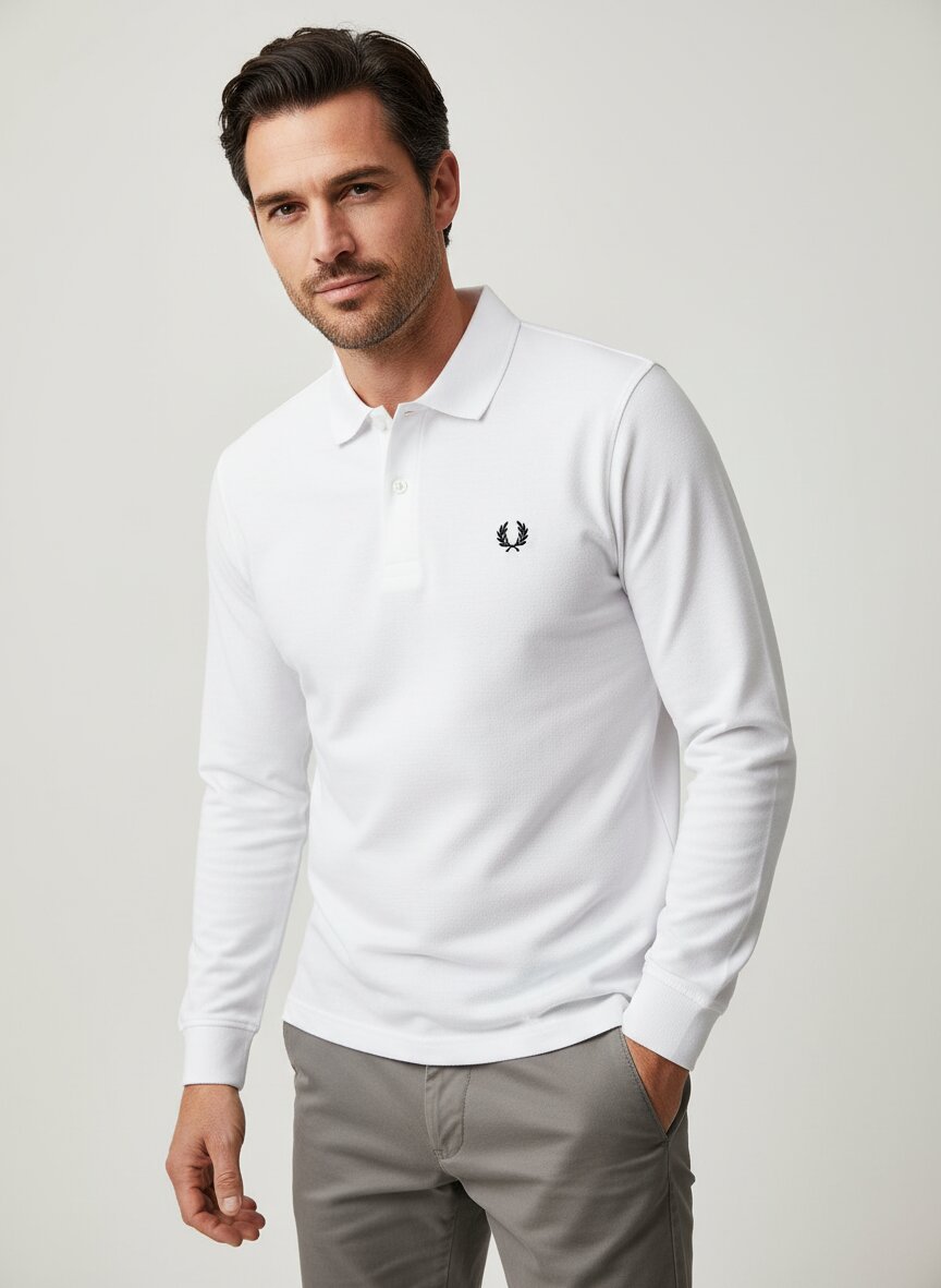 Das strahlend weiße Langarm-Polo zeigt sich in der charakteristischen Piqué-Struktur, die dem Stoff seine griffige Textur und natürliche Atmungsaktivität verleiht. Die reine Baumwolle fühlt sich angenehm kühl auf der Haut an und reguliert die Körpertemperatur bei wechselnden Bedingungen. Mit seiner cleanen Optik passt das Polo sowohl zum Business-Casual-Look als auch zur entspannten Freizeitgarderobe. Die Ärmel schließen mit feinen Rippenstrickbündchen ab, während die klassische Knopfleiste für variable Styling-Optionen sorgt. Fred Perry steht seit 1952 für britische Sporteleganz – der kleine Lorbeerkranz am Brustbereich ist längst zum Erkennungszeichen einer stilbewussten Generation geworden.Unser Tipp: Tragen Sie das Polo zur dunkelblauen Chino und braunen Lederschuhen für einen zeitlos eleganten Auftritt.