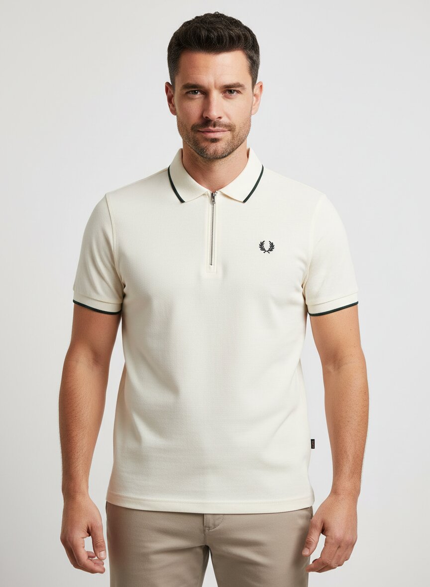 Die ecru-farbene Baumwolle wird durch dunkle Kontraststreifen an Ärmelbündchen und Kragen gebrochen – ein Design, das Fred Perry seit Jahrzehnten prägt. Das Material ist reine Baumwolle in feiner Kreppqualität, die auf der Haut angenehm atmet und dabei strapazierfähig bleibt. Der durchgehende Reißverschluss macht das Polo flexibel einsetzbar: offen als Layering-Piece, geschlossen als eigenständiges Shirt für Alltag und Freizeit. Die klassische Schnittführung mit Kurzarm sitzt mit Rückenlänge von etwa 69 cm (bei Größe M) zeitlos proportioniert. Fred Perry verbindet seit 1952 britische Tennistradition mit kulturellem Understatement – das Lorbeerkranz-Logo steht für Qualität ohne Kompromisse und Stil, der nicht laut sein muss.Unser Tipp: Kombinieren Sie das Polo offen über einem weißen T-Shirt mit dunkler Chino und Ledersneakern für einen entspannten Urban-Look, oder tragen Sie es geschlossen zu Shorts für warme Frühjahrstage.