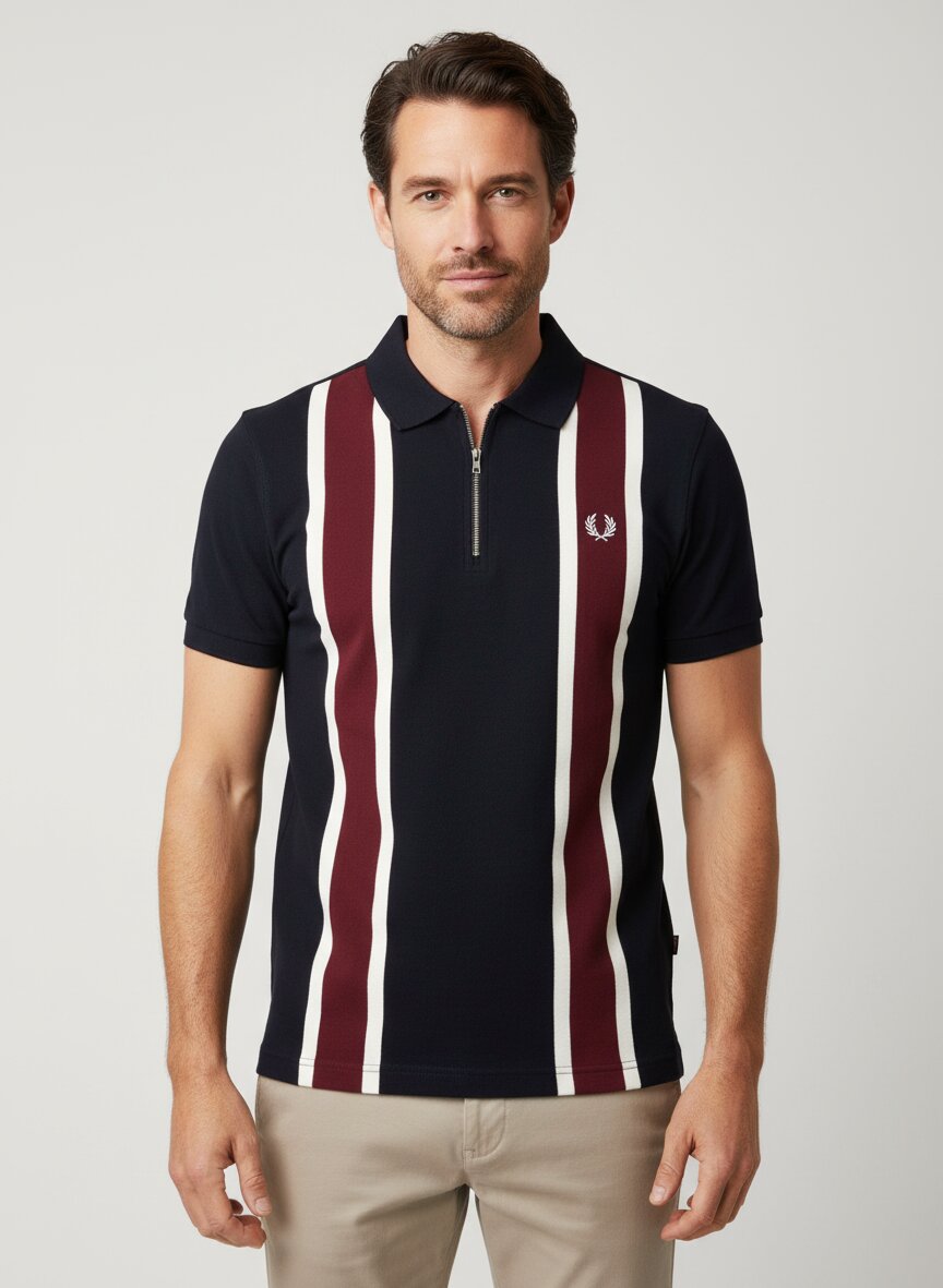 Die vertikalen Streifen in Schwarz und Bordeaux verleihen diesem Zip-Polo eine klassisch-britische Eleganz mit subtiler Spannung. Das Material ist reine Baumwolle in Piquè-Qualität – eine feinere Webung, die Atmungsaktivität mit natürlicher Griffigkeit verbindet und auch bei regelmäßigem Tragen seine Form bewahrt. Der durchgehende Reißverschluss macht ihn flexibel einsetzbar: vollständig geschlossen für strukturierte Momente, halb offen für Alltag und Freizeit. Die Kurzarmform und die präzise Schnittführung (bei Größe M: Rückenlänge ca. 71 cm) sorgen für eine moderne, nicht zu breite Silhouette. Fred Perry verbindet seit 1952 Tennisherkunft mit kulturellem Selbstbewusstsein – dieser Polo verkörpert genau diesen Anspruch: sportlich präzise, ohne Kompromisse bei der Verarbeitung.Unser Tipp: Tragen Sie das Shirt mit einer hellen Chino und weißen Sneakern für einen mühelosen Urban-Look, oder kombinieren Sie es mit dunkler Jeans und einem Blazer für mehr Struktur.