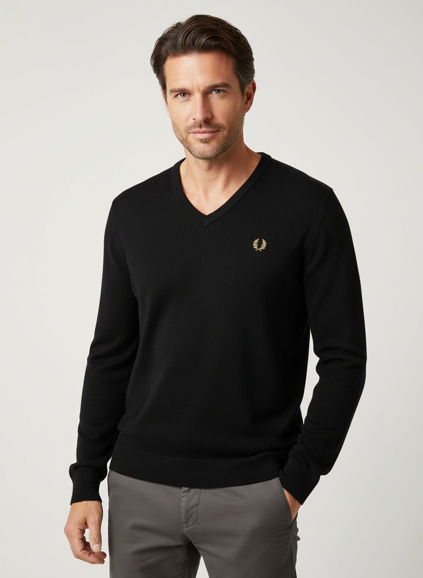Das tiefe Nachtblau verleiht diesem Pullover eine elegante Ausstrahlung, während der klassische V-Ausschnitt für eine schmeichelhafte Silhouette sorgt. Die hochwertige Mischung aus 52% Wolle und 48% Baumwolle bietet optimale Wärmeisolation bei gleichzeitig hoher Atmungsaktivität – ideal für temperaturwechselnde Tage. Der Pullover eignet sich sowohl für den smarten Business-Casual-Look als auch für entspannte Wochenenden. Die mittlere Rückenlänge von 70 cm und die komfortable Brustweite von 106 cm in Größe M garantieren eine moderne, nicht zu enge Passform. Fred Perry verbindet seit 1952 britische Tennistradition mit zeitlosem Design – der kleine Lorbeerkranz am Saum steht für authentische Sportswear mit Stil.Unser Tipp: Tragen Sie den Pullover über einem weißen Oxford-Hemd für einen gepflegten Büro-Look oder kombinieren Sie ihn lässig zur dunklen Jeans.