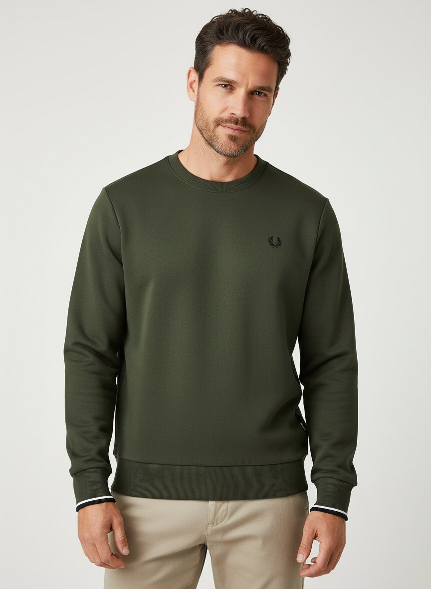 Das klassische Olivgrün wird durch feine Kontraststreifen an den Ärmelbündchen aufgelockert und verleiht dem Sweatshirt eine dezent sportive Note. Die reine Baumwolle sitzt weich auf der Haut und bietet maximale Atmungsaktivität, während die breiten Rippenstrickbündchen an Ärmeln und Saum für Halt und Langlebigkeit sorgen. Mit seinem rundlichen Ausschnitt und der geraden Silhouette funktioniert das Piece mühelos im Alltag – von der Freizeit bis zum lockeren Office-Look. Die olivgrüne Färbung ist zeitlos und kombiniert sich problemlos mit Chinos, Jeans oder Jogger in Grau und Creme. Fred Perry verbindet seit 1952 britische Tennerstradition mit urbaner Alltagstauglichkeit – dieses Sweatshirt steht für diese Balance aus sportlichem Erbe und modernem Understatement.Unser Tipp: Tragen Sie das Sweatshirt in der kälteren Jahreszeit über einem weißen T-Shirt und kombinieren Sie es mit einer dunklen Wollweste für einen geschichteten, herbstlichen Look.