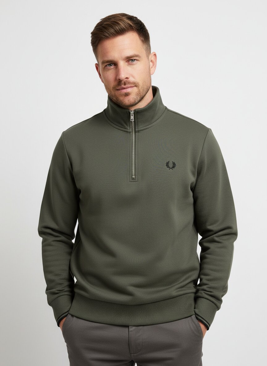 Der Troyer zeichnet sich durch markante Kontraststreifen an den Ärmelbündchen aus, die ihm eine dezente, aber unverkennbare Fred Perry Signatur geben. Der kurze Reißverschluss und der Stehkragen sind weitere charakteristische Features.