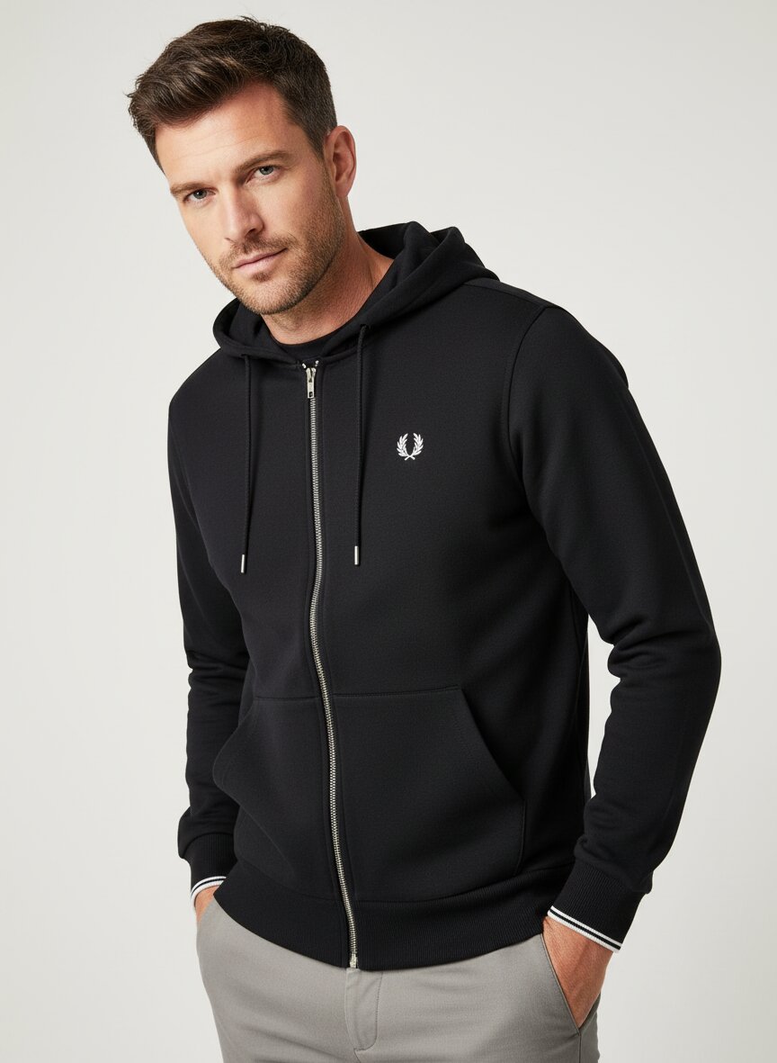 Die schwarze Grundfarbe wird durch markante Kontraststreifen an Ärmelbündchen und Kordelzug aufgelockert – ein dezenter Akzent, der sportliche Eleganz vermittelt. Der weiche Baumwoll-Mix (79% Baumwolle, 21% Polyester) fühlt sich angenehm auf der Haut an und bietet gleichzeitig Formstabilität für den täglichen Einsatz. Mit durchgehendem Metallreißverschluss und Kapuze eignet sich die Jacke ideal für entspannte Freizeitmomente oder als lässige Schicht über T-Shirt und Hemd. Die Kängurutaschen bieten praktischen Stauraum, während die Rippenstrickbündchen für optimalen Sitz sorgen. Fred Perry verbindet seit 1952 britische Tennistradition mit subkulturellem Einfluss – der gestickte Lorbeerkranz auf Brusthöhe steht für diese einzigartige Mischung aus Sport und Stil.Unser Tipp: Kombinieren Sie die Jacke zu hellen Chinos und weißen Sneakern für einen kontrastreichen Look, oder ton-in-ton zu schwarzen Jeans für urbane Eleganz.