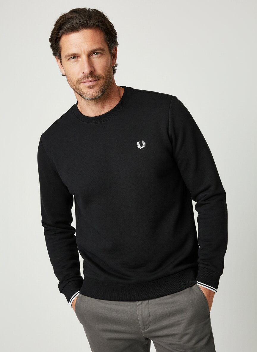 Die dunkelblaue Grundfarbe wird durch schmale Kontraststreifen an den Ärmelbündchen aufgelockert – ein subtiles Detail, das den sportiven Charakter unterstreicht. Der weiche Baumwoll-Mix schmiegt sich angenehm an und bietet dank 21% Polyester-Anteil Formstabilität und pflegeleichte Eigenschaften. Das gerade geschnittene Sweatshirt funktioniert sowohl solo als auch unter einer Jacke für kühlere Tage. Die klassischen Rippenstrickbündchen an Ausschnitt, Ärmeln und Saum sorgen für optimalen Sitz und Tragekomfort. Fred Perry verbindet seit 1952 britische Tennistradition mit subkultureller Coolness – der gestickte Lorbeerkranz auf der Brust steht für diese einzigartige Mischung aus Sport und Stil.Unser Tipp: Kombinieren Sie das Sweatshirt mit hellen Chinos und weißen Ledersneakern für einen entspannten Wochenend-Look.