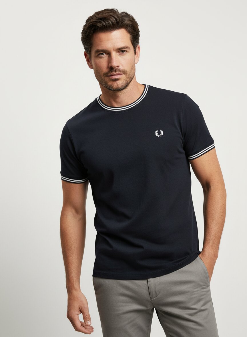 Das dunkelgrüne T-Shirt zeichnet sich durch markante weiße Kontraststreifen an den Rippenstrickabschlüssen (Hals- und Ärmelkanten) sowie das ikonische Fred Perry Lorbeerkranz-Logo auf der Brust aus.