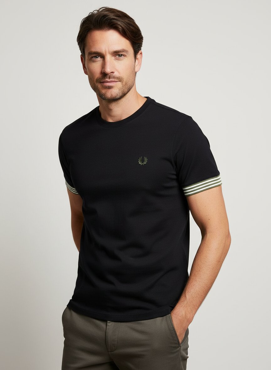 Die gestreiften Rippenstrickbündchen an den Ärmeln setzen markante Kontraste zum tiefschwarzen Piqué-Gewebe. Das strukturierte Baumwollpiqué fühlt sich griffig an, transportiert Feuchtigkeit nach außen und behält auch nach häufigem Tragen seine Form. Mit klassischem Rundhalsausschnitt und verstärkendem Nackenband sitzt das Shirt bequem für Alltag und Freizeit. Die Rückenlänge von 72 cm bei Größe M sorgt für eine moderne, nicht zu lange Passform. Fred Perry verbindet seit 1952 britische Tennistradition mit zeitlosem Understatement – der Lorbeerkranz steht für sportliche Eleganz jenseits kurzlebiger Trends.Unser Tipp: Tragen Sie das Piqué-Shirt zu dunkler Denim und weißen Ledersneakern für einen cleanen Casual-Look.