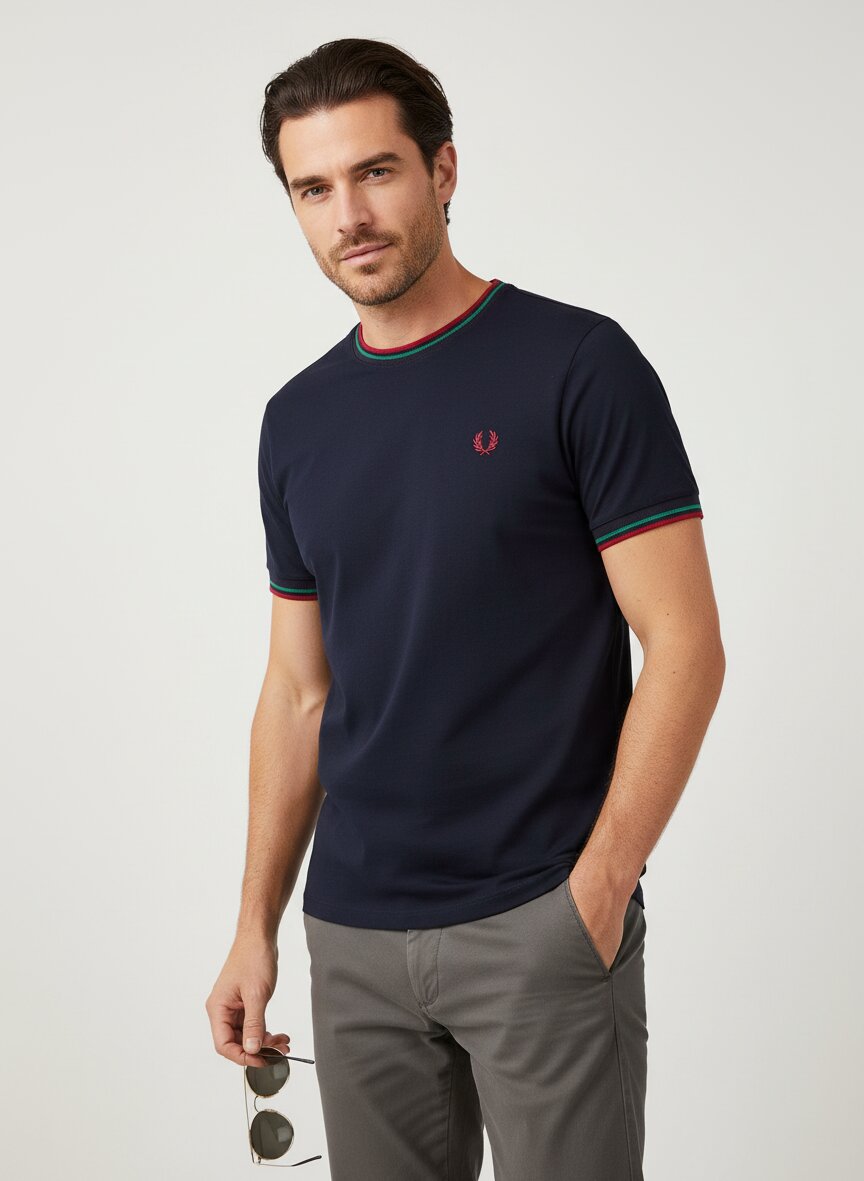 Die sportiven Kontraststreifen an den Rippenstrickabschlüssen verleihen diesem dunkelgrünen T-Shirt einen charakteristischen Look. Die reine Baumwolle fühlt sich angenehm weich an und bietet atmungsaktiven Tragekomfort für warme Tage. Der klassische Rundhalsausschnitt macht das Shirt zum vielseitigen Begleiter für Freizeit und urbane Anlässe. Die präzise Verarbeitung zeigt sich in den sauberen Abschlüssen und der formstabilen Passform. Fred Perry verbindet seit 1952 britische Tennistradition mit zeitlosem Design – der ikonische Lorbeerkranz steht für authentische Sportswear mit Subkultur-Appeal.Unser Tipp: Kombinieren Sie das T-Shirt mit hellen Chinos und weißen Canvas-Sneakern für einen entspannten Retro-Look.