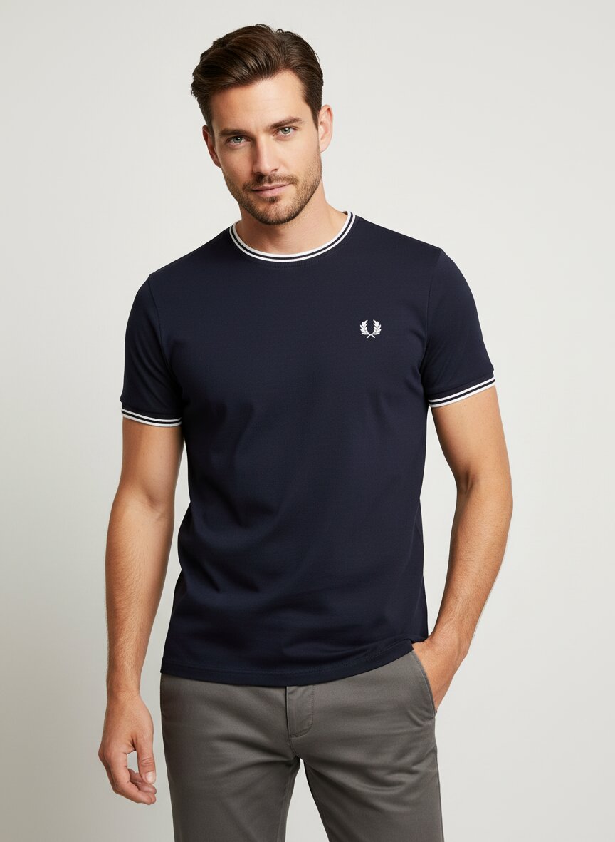 Das marineblaue Baumwoll-T-Shirt besticht durch feine Kontraststreifen an Rundhals-Ausschnitt und Ärmelbündchen – ein subtiles Detail, das sofort Fred-Perry-Kenner erkennen. Die reine Baumwolle sitzt angenehm auf der Haut, atmet zuverlässig und behält auch nach häufigem Waschen ihre Form und Farbtiefe. Mit seinem schlichten Schnitt und den sportlichen Akzenten funktioniert das Shirt mühelos im Alltag, zur Chino ebenso wie zur Jeans. Die Rückenlänge von etwa 71 cm (Größe M) bietet optimale Proportionen ohne zu lang oder kurz zu wirken. Fred Perry verbindet seit 1952 britische Tennerstradition mit kulturellem Understatement – dieses T-Shirt verkörpert genau diese Philosophie: zeitlos, präzise verarbeitet und ohne überflüssige Gesten.Unser Tipp: Kombinieren Sie das Navy-Shirt mit einer hellgrauen Wollweste und dunklen Jeans für einen dezent eleganten Look, der von Frühling bis Herbst trägt.