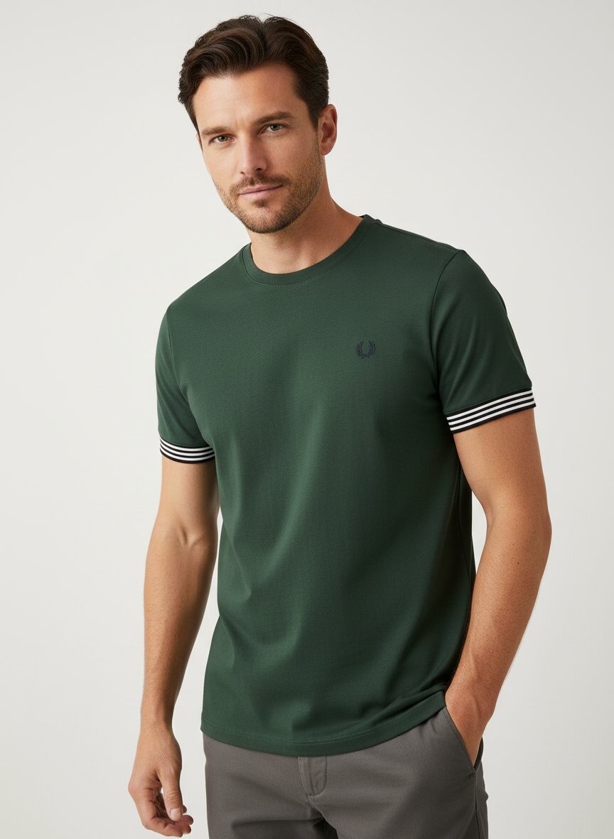 Die gestreiften Rippenstrickbündchen an den Ärmeln setzen markante Kontraste zum weinroten Piqué-Gewebe. Das strukturierte Baumwollpiqué fühlt sich griffig an, transportiert Feuchtigkeit nach außen und behält auch nach häufigem Tragen seine Form. Mit klassischem Rundhalsausschnitt und verstärkendem Nackenband sitzt das Shirt bequem für Alltag und Freizeit. Die Rückenlänge von 72 cm bei Größe M sorgt für eine moderne, nicht zu lange Passform. Fred Perry verbindet seit 1952 britische Tennistradition mit zeitlosem Understatement – der Lorbeerkranz steht für sportliche Eleganz jenseits kurzlebiger Trends.
