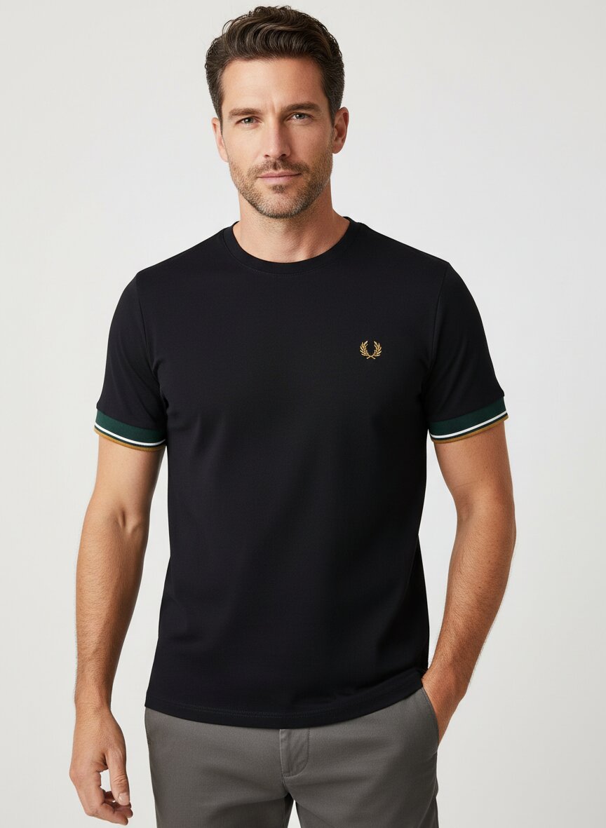 Das Polo-Shirt besticht durch sein zeitloses Design in tiefem Schwarz, das durch dezente gestreifte Akzente an den Ärmeln aufgelockert wird. Die feine Baumwoll-Piqué-Qualität bietet angenehme Atmungsaktivität und eine griffige Oberflächenstruktur, die auch nach häufigem Tragen ihre Form behält. Mit Rundhalsausschnitt und verstärkendem Nackenband sitzt das Shirt sicher und komfortabel – ideal für entspannte Wochenenden oder casual-elegante Anlässe. Die gestreiften Rippenstrickbündchen an den Ärmeln verleihen dem klassischen Schnitt eine subtile sportliche Note. Fred Perry verbindet seit 1952 britische Tennistradition mit kulturellem Selbstbewusstsein – dieses Polo verkörpert diese Philosophie in ihrer reinsten Form: zeitlos, funktional und authentisch.Unser Tipp: Kombinieren Sie das schwarze Polo mit einer hellen Chino und weißen Sneakern für einen modernen Urban-Look, oder tragen Sie es zu einer Navy-Chino für klassische Eleganz.