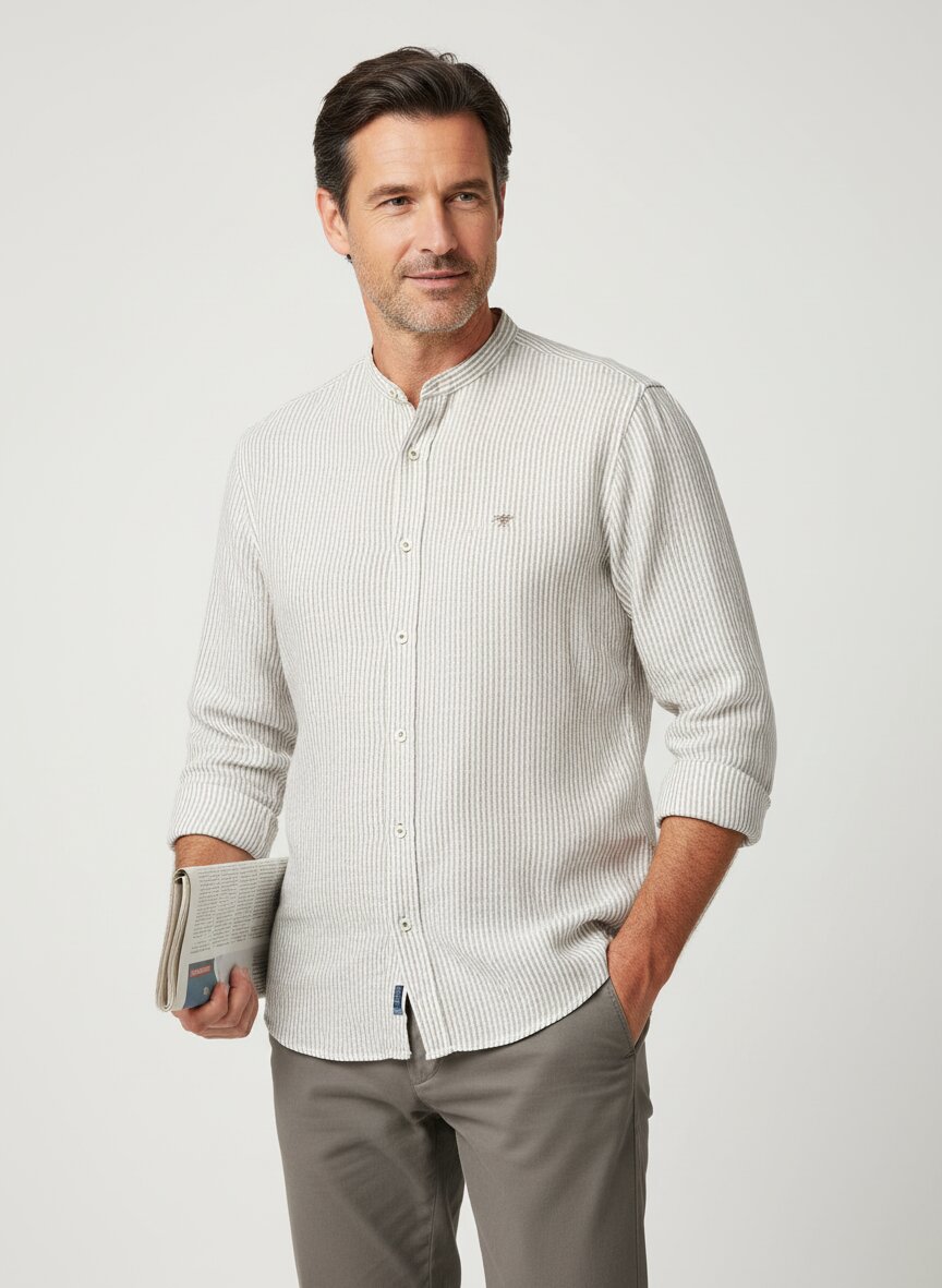 Fynch-Hatton, Hemd, Reines Leinen, Stehkragen, khaki gestreift