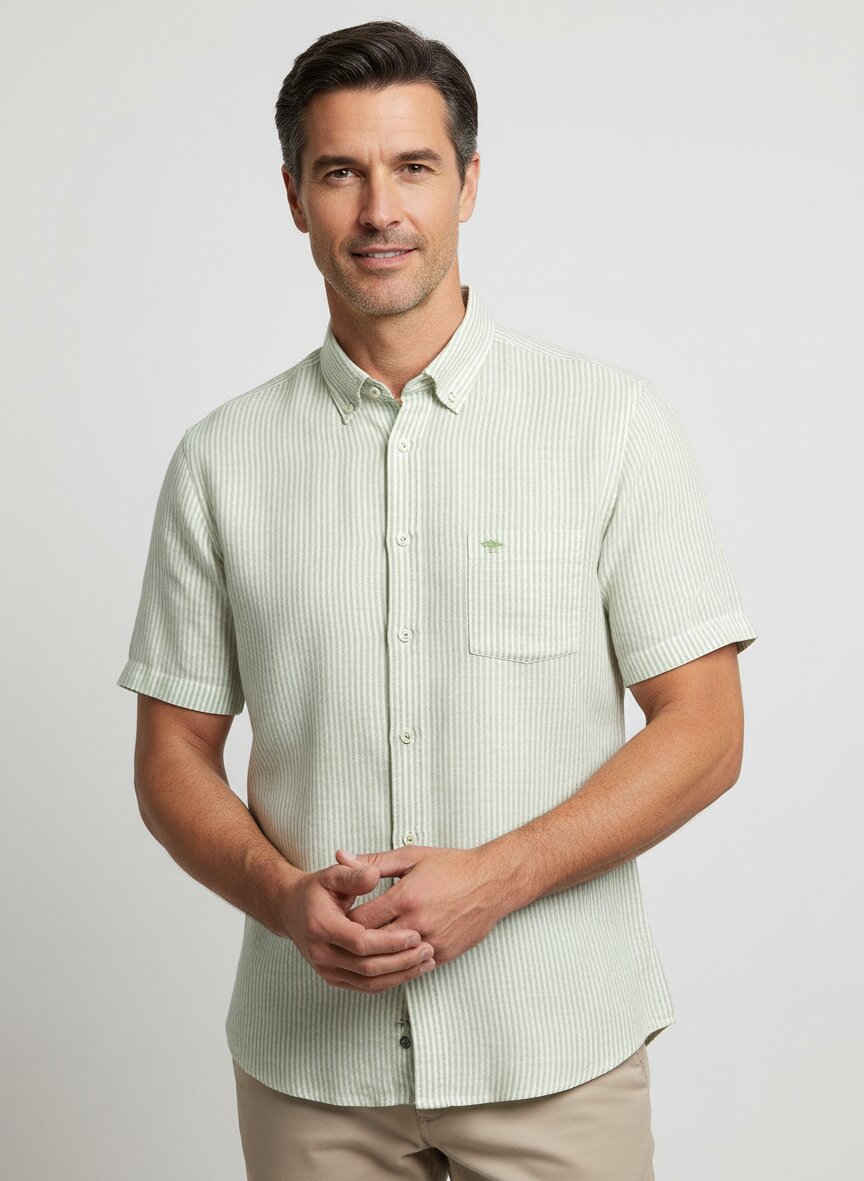 Fynch-Hatton, Kurzarmhemd, Reines Leinen, Button-Down, Brusttasche, grün gestreift
