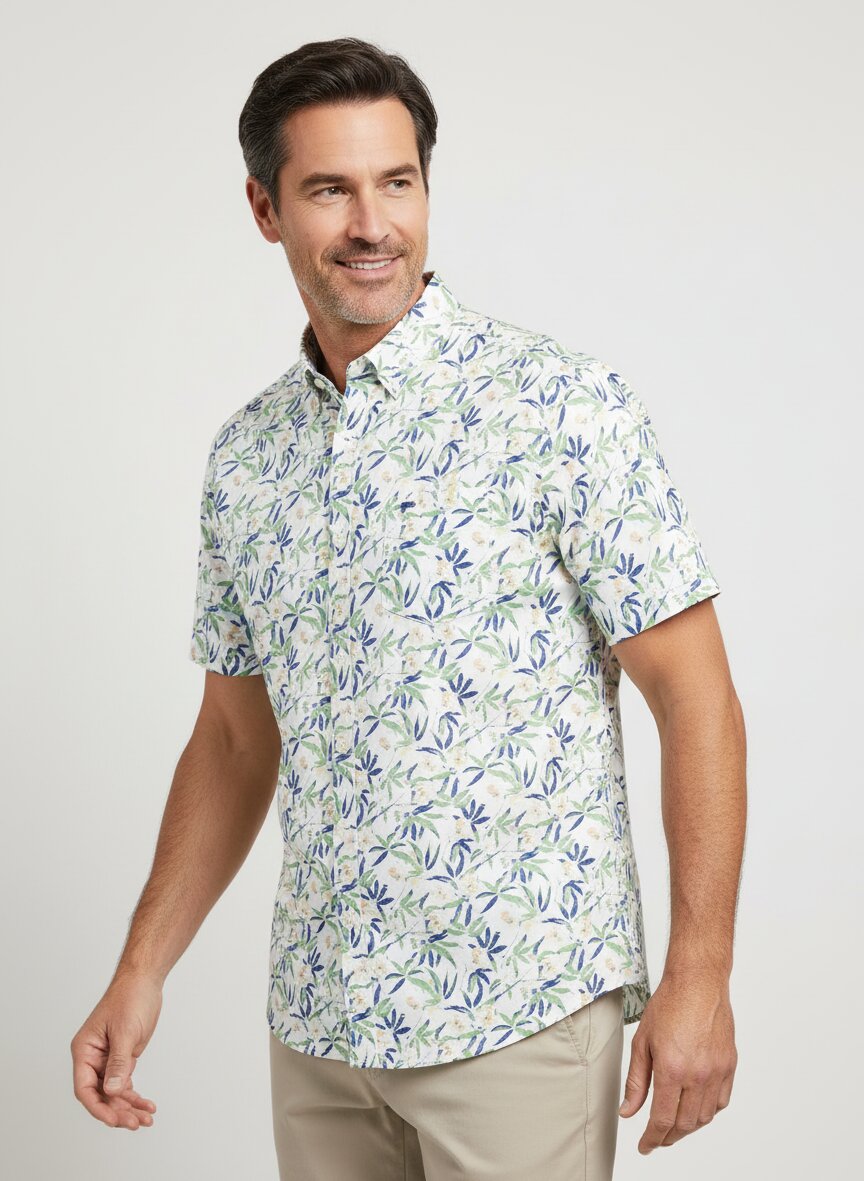 Das Hemd zeigt ein multicolor gemustertes Blattmotiv in Blau- und Grüntönen auf cremefarbenem Untergrund. Es ist perfekt für die Frühjahrs- und Sommersaison geeignet.