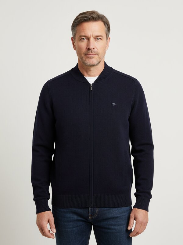 Der tiefe Dunkelblau-Ton und der durchgehende Reißverschluss in Metall-Optik verleihen diesem Cardigan eine moderne, urbane Note. Die kompakte Baumwollqualität fühlt sich griffig an und behält ihre Form – ideal für kühlere Tage, an denen Sie auf synthetische Fasern verzichten möchten. Mit seinem cleanen Collegekragen und den formgestrickten Raglanärmeln sitzt er lässig und bewegungsfreundlich zugleich. Die seitlichen Einschubtaschen bieten praktischen Stauraum für Smartphone oder Schlüssel. FYNCH-HATTON interpretiert klassische Strickmode neu – mit deutscher Gründlichkeit und einem Gespür für entspannte Eleganz.Unser Tipp: Tragen Sie den Cardigan über einem weißen T-Shirt zur dunklen Jeans – ein zeitloser Look für Büro und Freizeit.