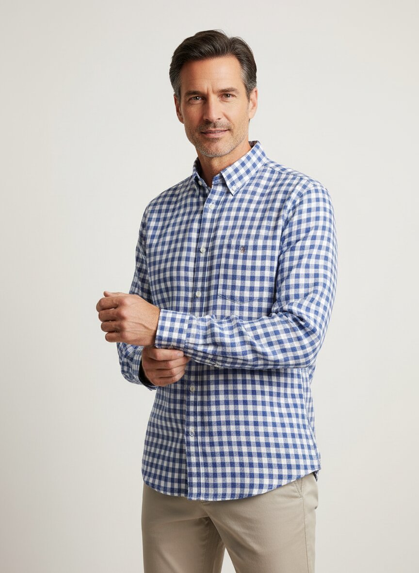 Das Hemd ist aus einer Mischung aus Baumwolle und Leinen gefertigt. Diese Kombination bietet optimale Atmungsaktivität und Langlebigkeit, ideal für Frühling und Sommer.