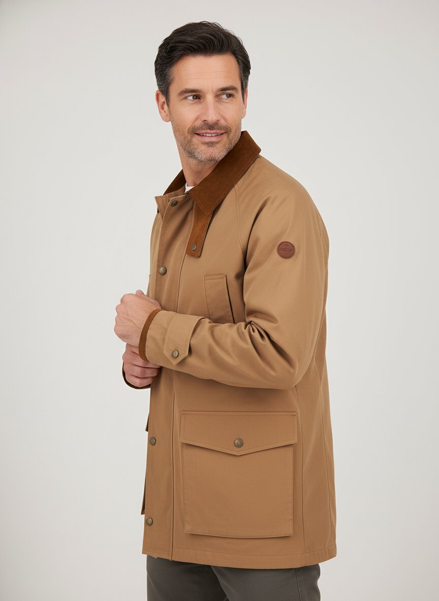 Die Jacke ist aus Baumwolle gefertigt, was sie zu einer langlebigen und atmungsaktiven Wahl für die wärmere Jahreszeit macht.