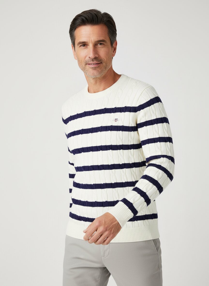 Der cremefarbene Pullover besticht durch horizontale dunkelblau-weiße Streifen, die ihm eine maritime Note verleihen – ein klassisches, nautisches Design von GANT.
