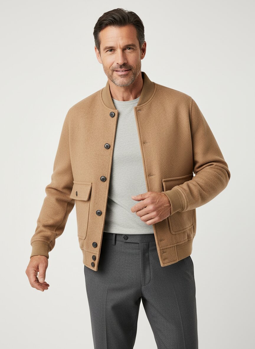 Der Blouson besteht aus einer hochwertigen Wollmischung mit 47% Schurwolle, die angenehm wärmt und gleichzeitig atmungsaktiv bleibt. Die Woll-Mischung behält dauerhaft ihre Form und eignet sich ideal für die Übergangszeit Herbst/Winter.