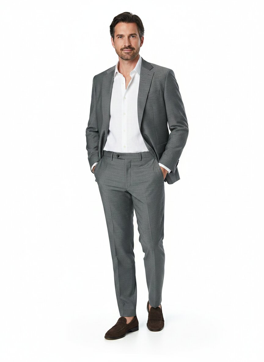 Die lebendig melierte Optik beschreibt ein durchmischtes Farbspiel im Stoff, das dem anthrazitfarbenen Anzug eine interessante Struktur und Tiefe verleiht. Dies macht ihn visuell interessanter als ein einfarbiger Anzug.