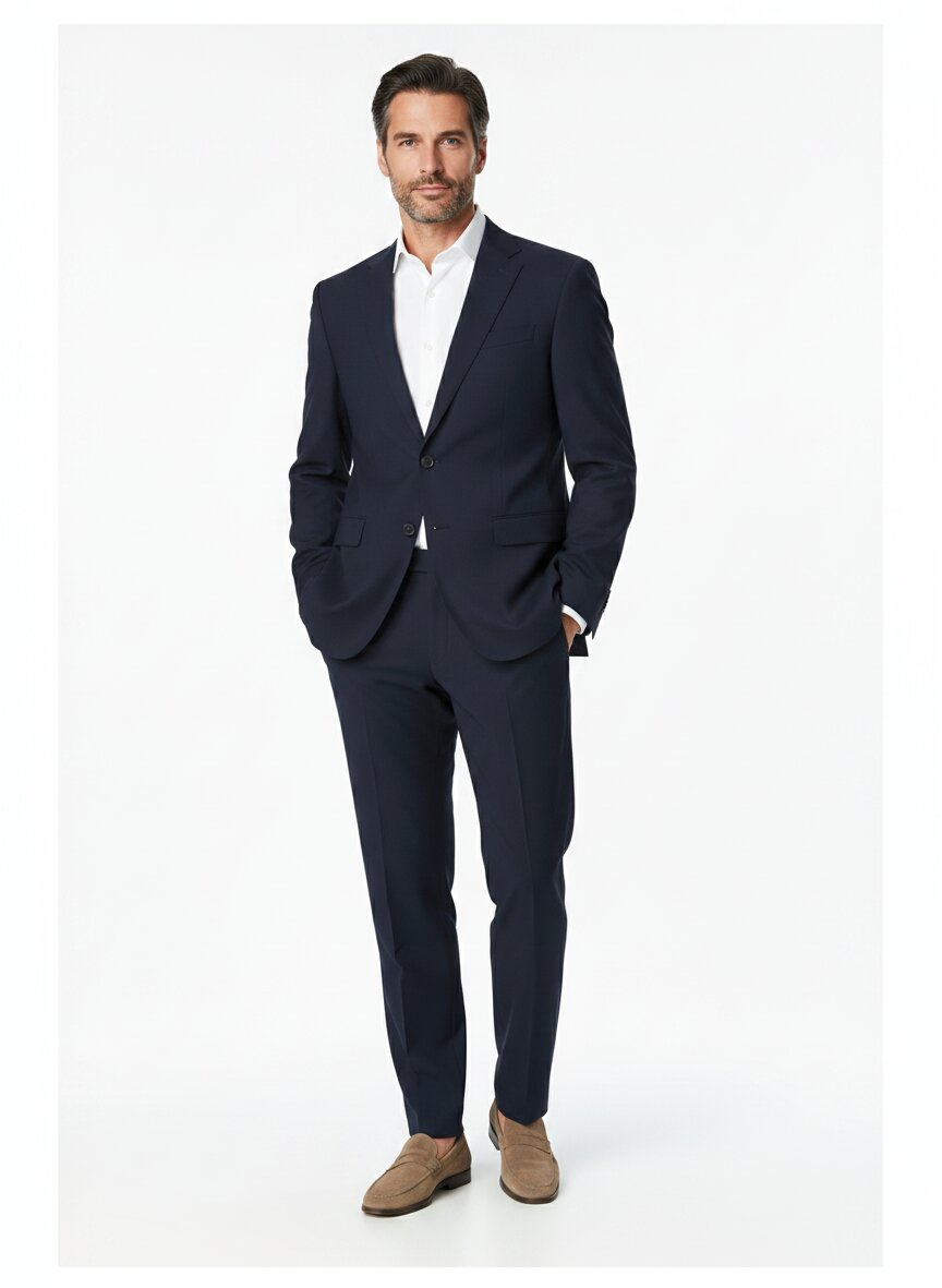 Der Anzug ist in Nachtblau erhältlich – eine klassische, vielseitige Farbe, die sowohl im Business als auch zu eleganten Anlässen getragen werden kann und zu verschiedenen Hemden und Accessoires passt.