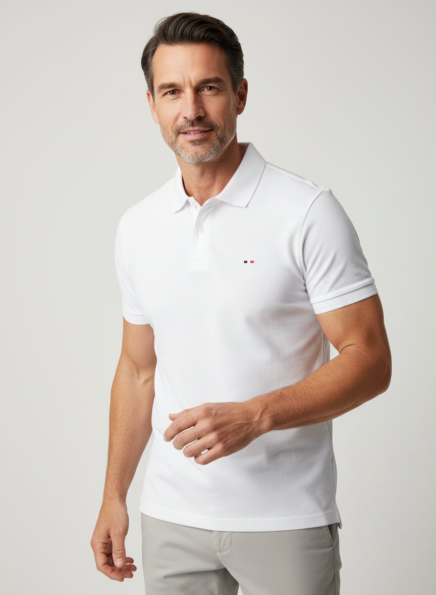 Das klassische weiße Polo-Shirt ist ein vielseitiger Klassiker. Es lässt sich perfekt zu Chinos, Jeans oder Shorts kombinieren und eignet sich sowohl für casual als auch für gehobene Freizeitlooks.