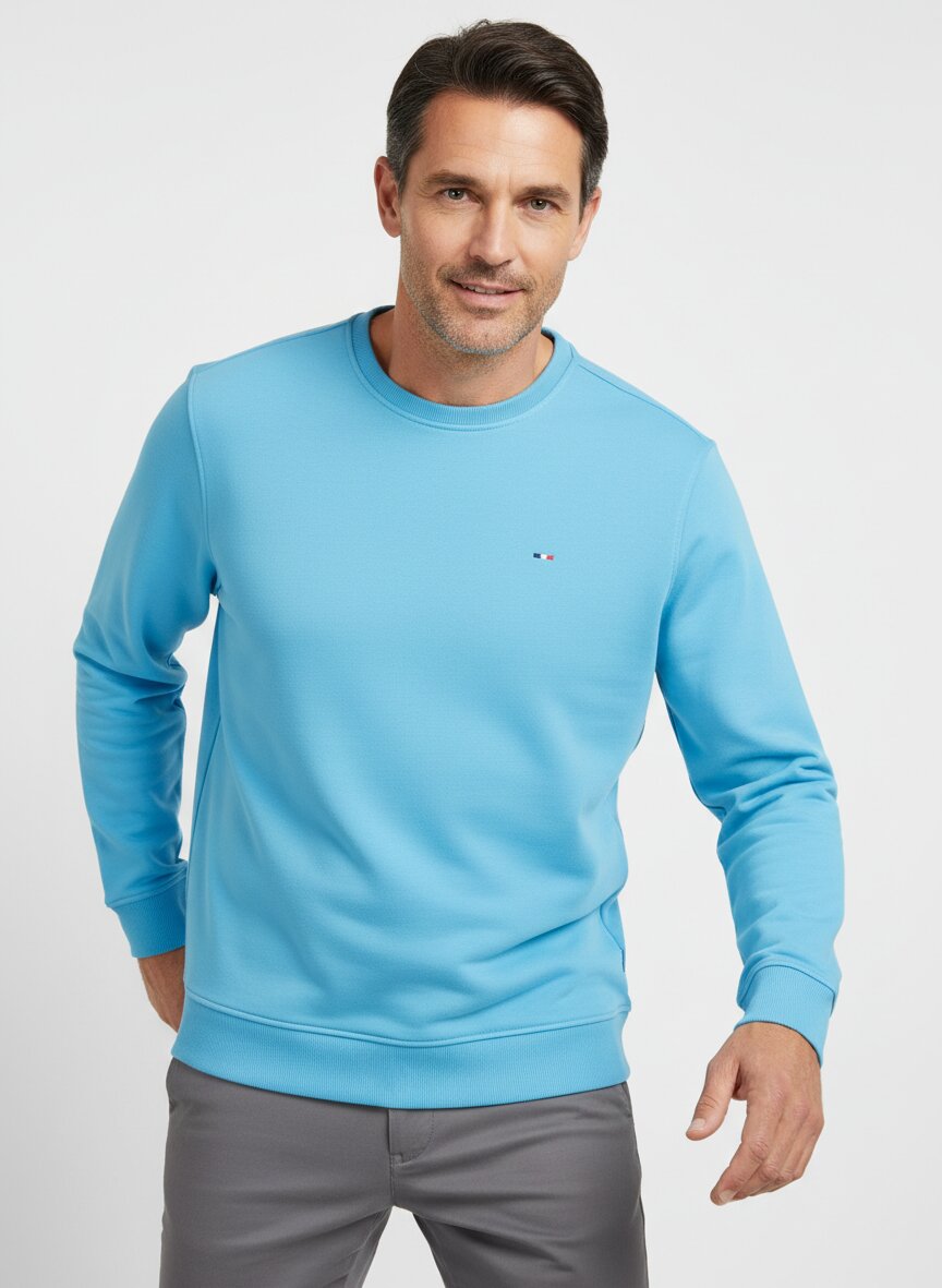 Das Sweatshirt lässt sich perfekt mit einer hellen Leinenhose und weißen Sneakern kombinieren für einen entspannten, sommerlichen Look. Die leuchtende Türkis-Farbe ist vielseitig einsetzbar und besticht auch in der Stadt.
