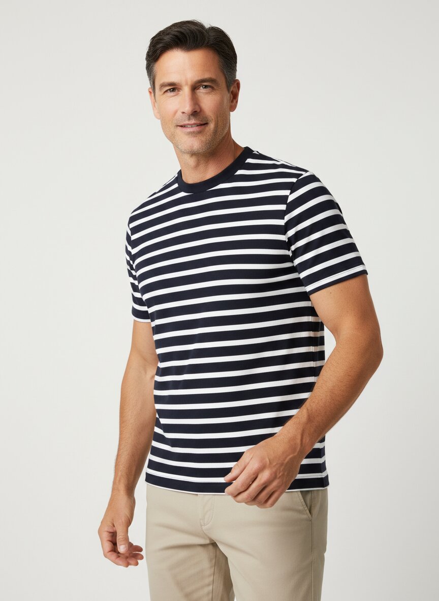 Das T-Shirt lässt sich mühelos mit einer hellen Leinenhose und weißen Canvas-Sneakern kombinieren – perfekt für einen sommerlichen Look, der in jeden Kontext passt. Die zeitlose Breton-Streifen-Optik macht es zu einem vielseitigen Basis-Piece.